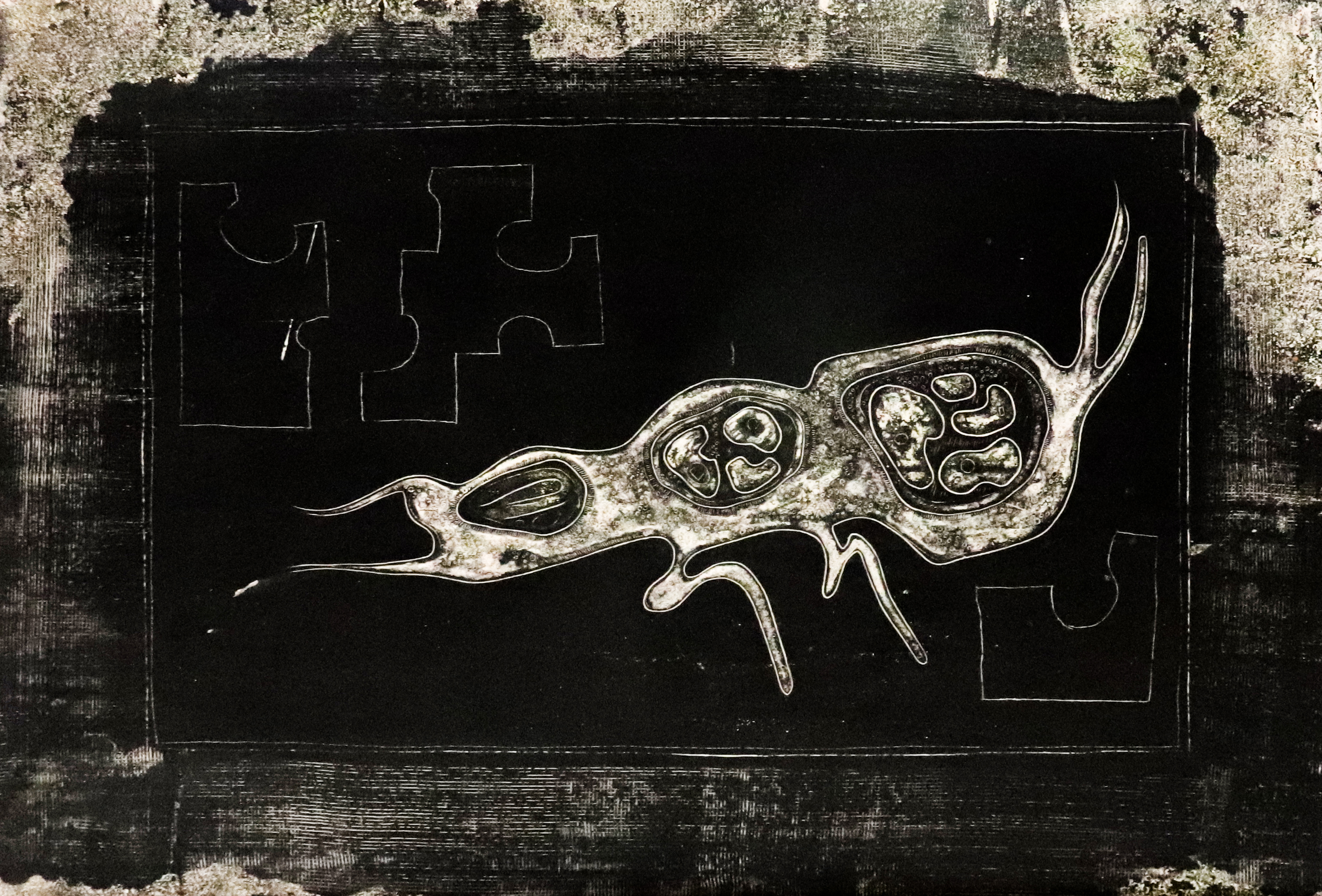 According to biographer Lois Rudnick, Wells’s postwar paintings “responded to the angst of the Atomic Age with references to barbed wire and the transformation of landforms into weapons, while others suggested prehistoric creatures.” His technique became increasingly complex. For these later works, he often used gouache to create deep black surfaces that he then textured and tinted using brushes of only a few hairs, along with palette knives, dental tools, and even dog combs for incising. This series of paintings, made between 1946 and 1948, earned Wells his greatest critical acclaim. His painting “Larvaeic” in the Roswell Museum’s collection was made during this period and depicts what appears to be a creature mutated by exposure to radioactive materials.