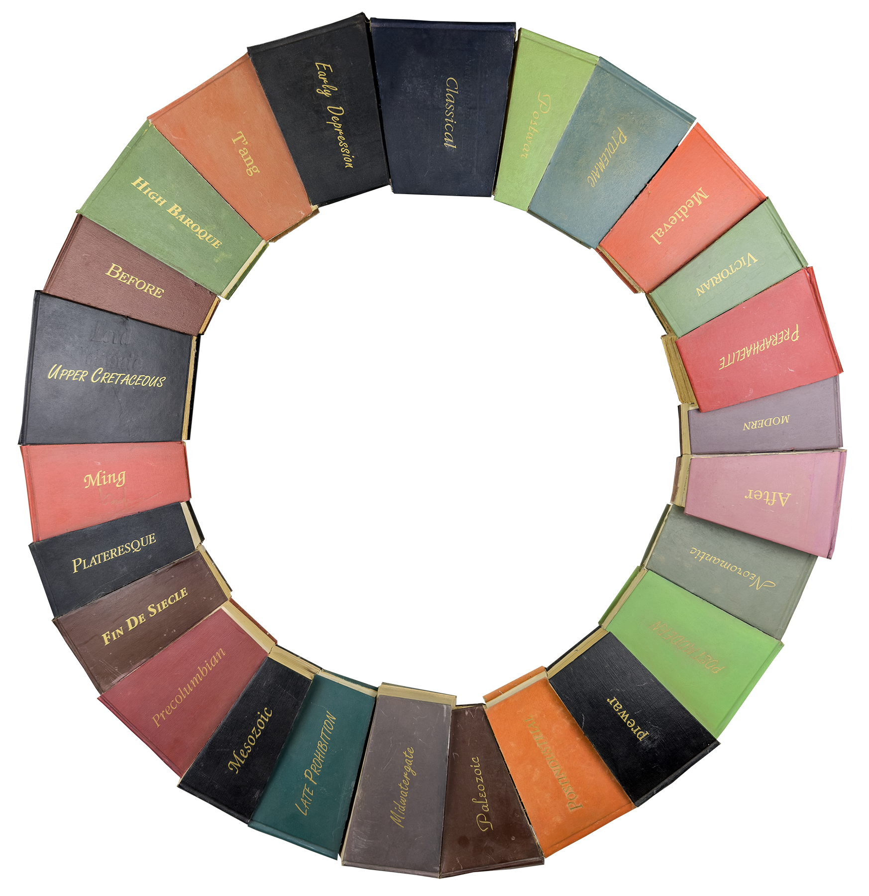 “Circular Time” by Maria Porges, 1990, Mixed Media, Books, Oil Paint, Wood, Gold Leaf, Gift of Ray Graham, 2023.004.0140