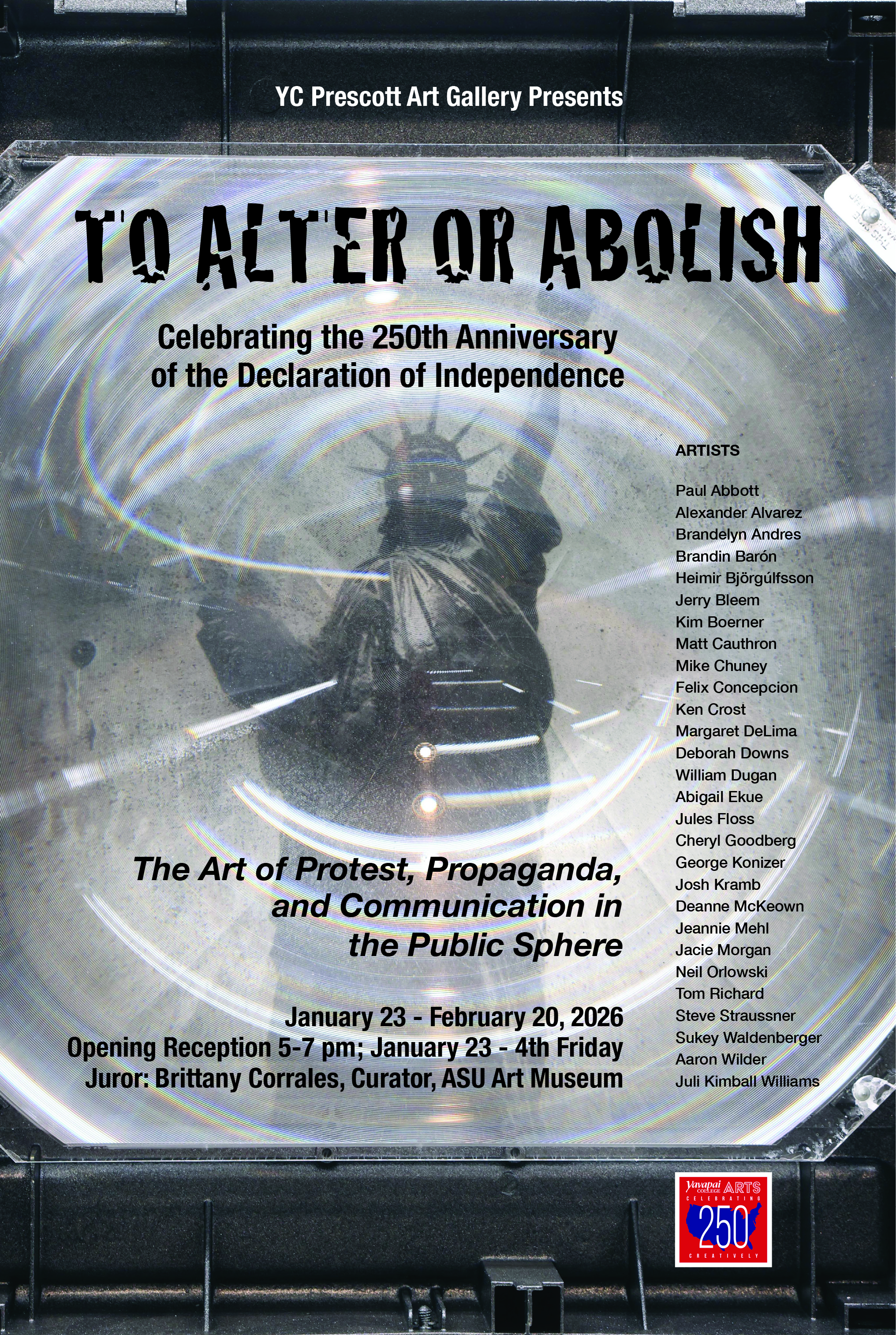 To mark the 250th anniversary of the American experiment, the Yavapai College Art Gallery presents To Alter or Abolish, an exhibition devoted to protest, propaganda, and communication in the public sphere, the very instruments by which a democracy speaks to itself, argues with itself, and, at its best, corrects itself. The Declaration of Independence frames the United States not as a finished project but as an ongoing proposition, a people asserting that governments derive “their just powers from the consent of the governed,” and that when power becomes destructive of human ends, “it is the Right of the People to alter or to abolish it.” Those lines insist that self-determination is not merely a private feeling but a public practice sustained through words, images, assemblies, and the contested spaces where citizens persuade one another.