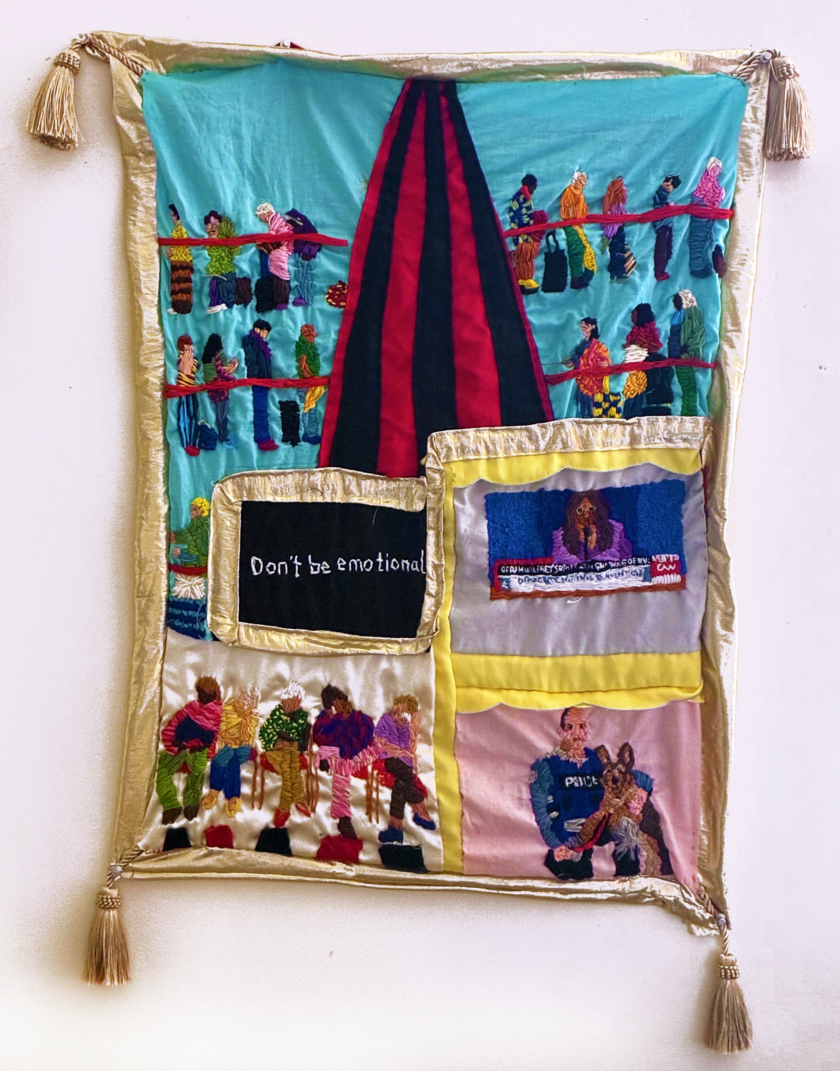 Jean Seestadtcreates textile works that reflect on our experiences when we’re captive audiences to media that endlessly bombard us with skewed messaging from dominant institutions: airport lounges, doctor’s office waiting rooms, the DMV, etc. Seestadt says she “documents the gnawing indignities of institutional spaces and the silent fury they generate, with each stitch repetitively tallying the time we must spend in these places.” The artist uses textiles because they are soothing objects that comfort us in times we need protection and stability. The artist has said: “I use textiles to study banal, generic spaces: security lines and medical waiting rooms with fish tanks, daytime TV, and drab seating. There is a logic to these spaces – they are bright! they are airy! — that intentionally hides what they do. These spaces hold and manage people during their most vulnerable life moments; moments when they might employ textiles to manage parting, returning, pain, and healing.” In Controlling Us, Seestadt shows people waiting in line where frames depict incessant messaging fed to us in the “down time.” A black screen reads “Don’t be emotional,” TV screens show a CNN broadcast and a talk show, and a police officer is shown posing with his K9. She says she “bridges the everyday and unexpected, opening cracks and fissures in routines and spaces of control that effervesce with humor and crackle with tension.” Her work encourages us to pause when we are in these places of enforced docility and waiting to consider how the information thrown at us is framed, how it is linked to institutions through invisible threads, and what effect it has on us.
