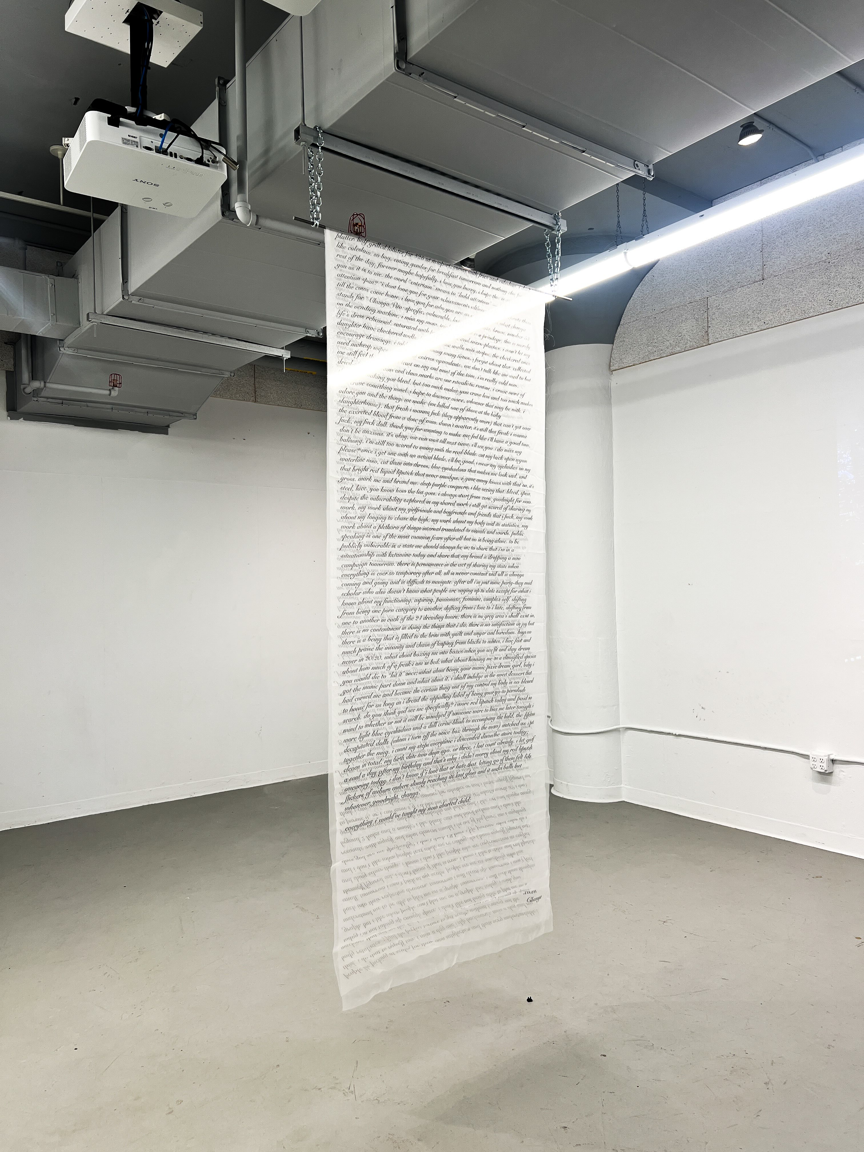 Chanya Vitayakul is an artist who works across design, installation, and sculpture. Their work “blends personal narrative with material investigation to examine how the body is written, held, and sometimes violated by external systems: gender, language, family, nationhood, medicine.” Vitayakul’s practice approaches the violence of language in these systems as having the capacity to both harm and defend a body. In their exhibited work, Everything I Would've Taught My Now Aborted Child, the artist embraces their vulnerability with regard to the taboo subject of abortion and rearticulates it as a method of resistance to abusive societal norms. In this defiantly vulnerable space where pain and closure intertwine, Vitayakul challenges what is “unspeakable.” In this work and others, the artist asks: What does it mean to be seen, and to survive that seeing?” In 2021, the state of Texas passed Senate Bill 8, which enables any citizen to bring a civil lawsuit against a medical professional or anyone else who “aids or abets” an abortion. While lawsuits cannot be brought against women seeking abortions, this law seeks to enforce an effective ban on abortions through state surveillance and punishment. “Making, for me, Vitayakul says, “amplifies voices where silence is imposed; it unsettles clarity, generating spaces where alternate readings, ruptures, and counter-narratives can emerge.”