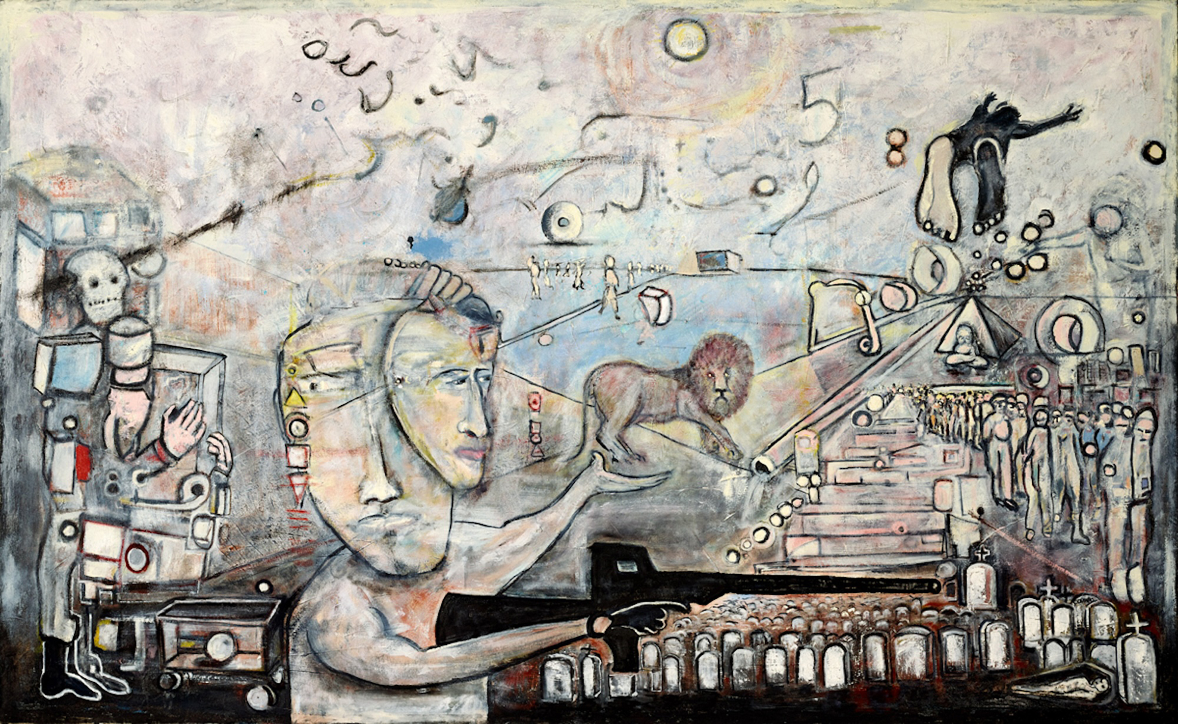 Charles Compo slows down the auto-filtering of our contemporary media onslaught through his paintings. He critiques the predefined narratives fed to us by using symbols and visual layering to make hatred and subjugation more identifiable for what they are. “Through the use of symbols,” Compo says, “I engage with painting as a manifestation and manipulation of the visual language of daily life.” His painting Now That’s What I Call a Target-Rich Environment, is loaded with symbolism portraying the visual chaos constantly bombarding us. Part of the title, “target-rich environment,” is itself a euphemism that the corporate world has appropriated (to indicate a field from which can be extracted many profit opportunities) from military terminology (to indicate a battlefield teeming with enemies to attack). In this painting, Compo exposes the insidious nature of language that simultaneously connects and glorifies violence and capitalism. One can see a clear link between mass violence and the gun industry. “Shedding light onto methods of domination and control by reweaving symbolic vocabulary and associations is vital to my reconciliation with the world,” he says. In what Compo describes as “the collective hallucination known as reality,” the deception of everyday language is deconstructed so that we can identify true intent of media to which we’re exposed.