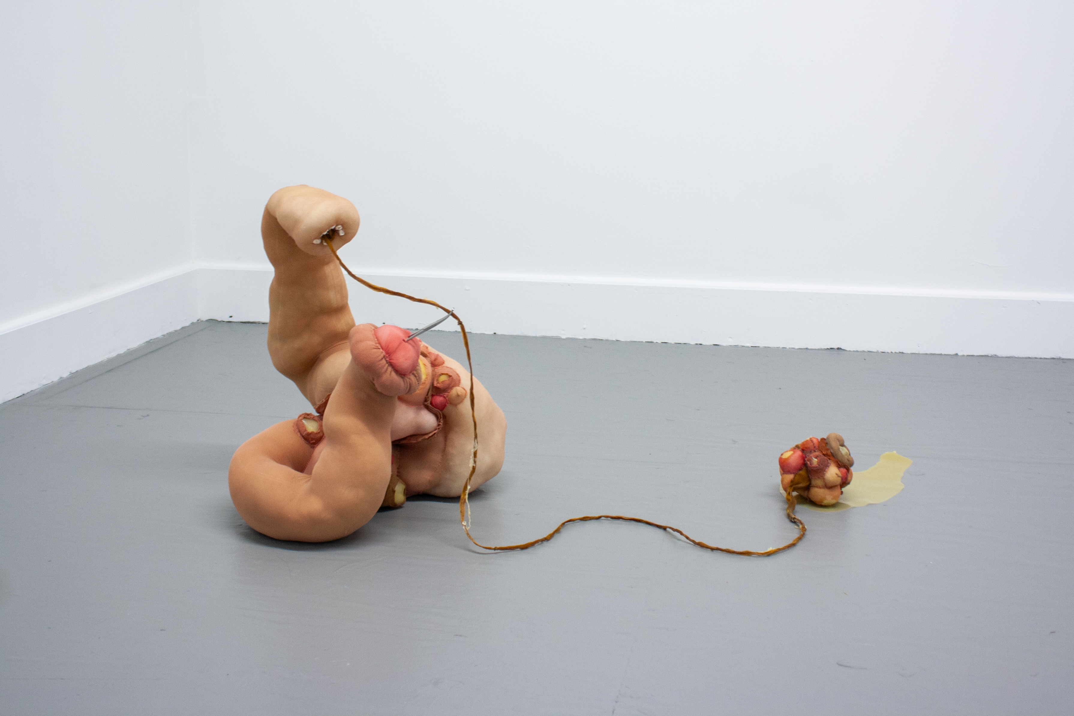 Isabella Covert makes soft sculptures and installations that turn the body inside out. These works challenge hegemonic systems that prioritize standardized, docile, cookie-cutter bodies trained to perpetuate this system. “Communicating the interplay of excess political control and gendered dynamics,” she says, “the entangled forms in my work abstract the body and its capabilities. Permeating a paradoxical allure with materials like latex and hair, my work serves as a surrogate for the body and the afflictions of bodily containment.” The bodies her work gives birth to are both a result and perpetuator of instability. “They violate rules imposed upon materials - tampering with tactile relationships that promote rapid aging, discoloration, and festering,” Covert says. In her exhibited sculpture, Leak Ligation, a bulbous, serpentine body has excreted a leaking form still tethered to its dental orifice while pincers protruding from its other phallic end move to surgically sever it. The form is as disturbing as it is erotic and it arouses a tension between natural biological evolution and synthetic biological engineering. Is it either or both? Through her work, Covert says she “investigates liberation and contradiction within synthetic biology.” This refers to a field of science where new biological parts and systems are engineered (genetically modified organisms, growing materials from cells, DNA programming, etc.). The possibilities of this speculative field include both the ethical problem of eugenics and the promise of expanded notions of identity. One of the questions Covert poses through her work is “Through developments of artificial wombs and egg harvesting, will advanced technology hold the ability to liberate women from the expectations of childbearing?” Time will tell, but, if the answer is “yes,” it’s unclear if that will mean the farming of mindlessly efficient cogs or fiercely autonomous mutants ushering in a reimagined, utopian reality. “I work in a space where I can pick at thoughts and potentialities of the body in the current era,” Covert says, “thinking critically about who and what we are becoming.”