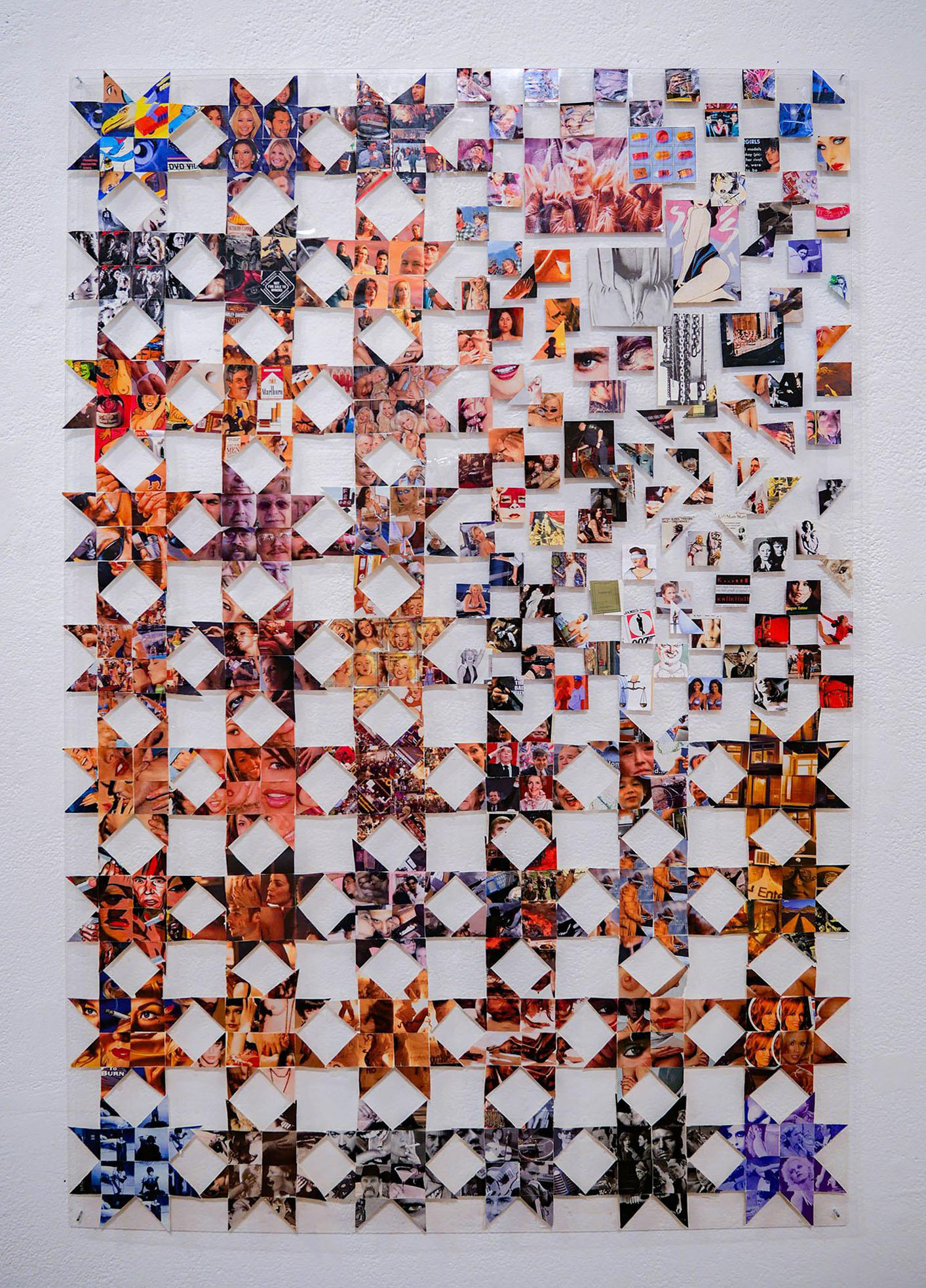 Annika Fricke says her art “explores the loop of production, consumption, desire, and resistance that constitutes the American Dream.” She uses the visual strategies of quilting and the practice of collage to challenge and destabilize dominant narratives. “Much of my work draws from traditional American quilt patterns,” Fricke says. “These patterns were historically used to preserve stories and pass down generational knowledge and now serve as a structure for visual resistance. By integrating these forms in my collages, I connect histories of care, labor, and protest with the language of contemporary media. The result echoes the cycles of consumption and control that define American life.” Fricke takes images from popular culture, including Playboy Magazine, to confront power and value structures with regard to gender and identity. Collage is an adept method of making subconscious messaging visible because it presents a simple recontextualization of preexisting imagery. As a result, it both identifies and questions what has become normalized in society. Fricke asks: “Is the body still natural, or has it become an abstracted tool of political subjectification—detached, commodified, and redefined to reinforce dominant American ideologies?” In Post Babel Construct, she presents a semi-transparent quilt of cut up and folded pop culture imagery. In referencing in this work the Tower of Babel from the Judeo-Christian tradition, where god thwarted the human attempt to build a tower to reach heaven by sowing cultural division, Fricke disentangles manipulated messaging and shows how contemporary identify is composed of fragments significantly influenced by capitalist forces.