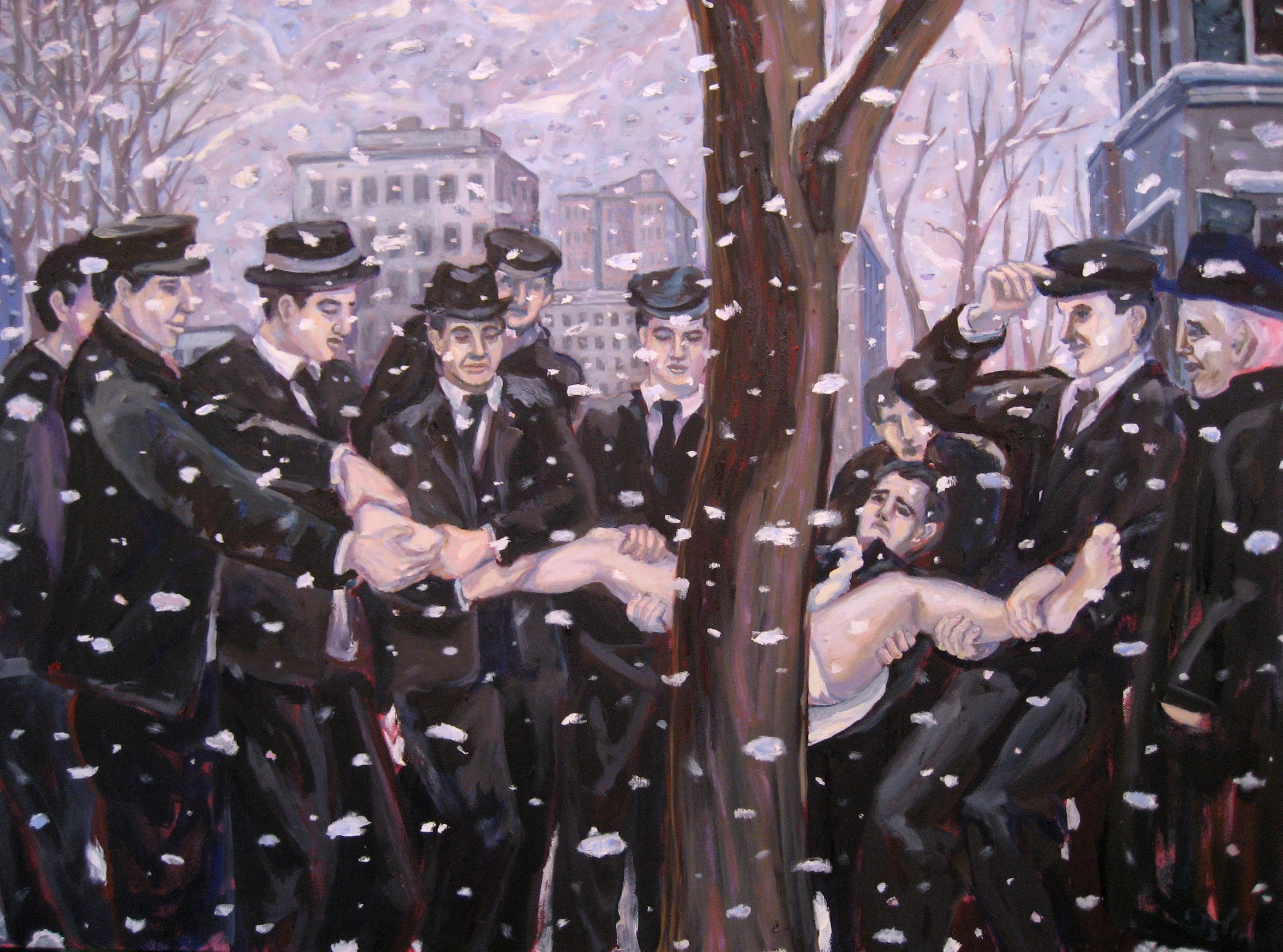 Tyler Alpern creates paintings loaded with subtle symbolism. His expressive style consistently evokes an emotional response through capturing the essence of an individual’s character. His painting Grand Old Party flips the script on the conservative political party’s repressive policies. “The painting is a visual metaphor for the outdated, rabidly homophobic values, ongoing legislative bullying and personal attacks of the Republican Party on gay people and their families,” Alpern says. “I made it winter to emphasize the coldness and brutality.” Aside from the violence depicted in the painting it can also be interpreted as a subversion of Republicans referring to liberals as “tree huggers.” In this dark portrayal, he turns the table on the representatives of institutions of power and their largely unchallenged propaganda that encourages the brutalization of queer individuals. Alpern cites the following examples: “In 2022, Florida and other Republican led states passed many anti-gay, anti-trans laws and their school boards banned books and curriculum in attempts to turn back the clock and erase gay people entirely. In 2023, book bannings, laws against Drag and Trans healthcare continue the never ending crusade of hate.” In the fear-mongering of the Republican Party, publicly anxiety over trans athletes “invading” women’s sports is exploited. Conservatives in power are also exerting control through banning even discussion of civil rights in schools.