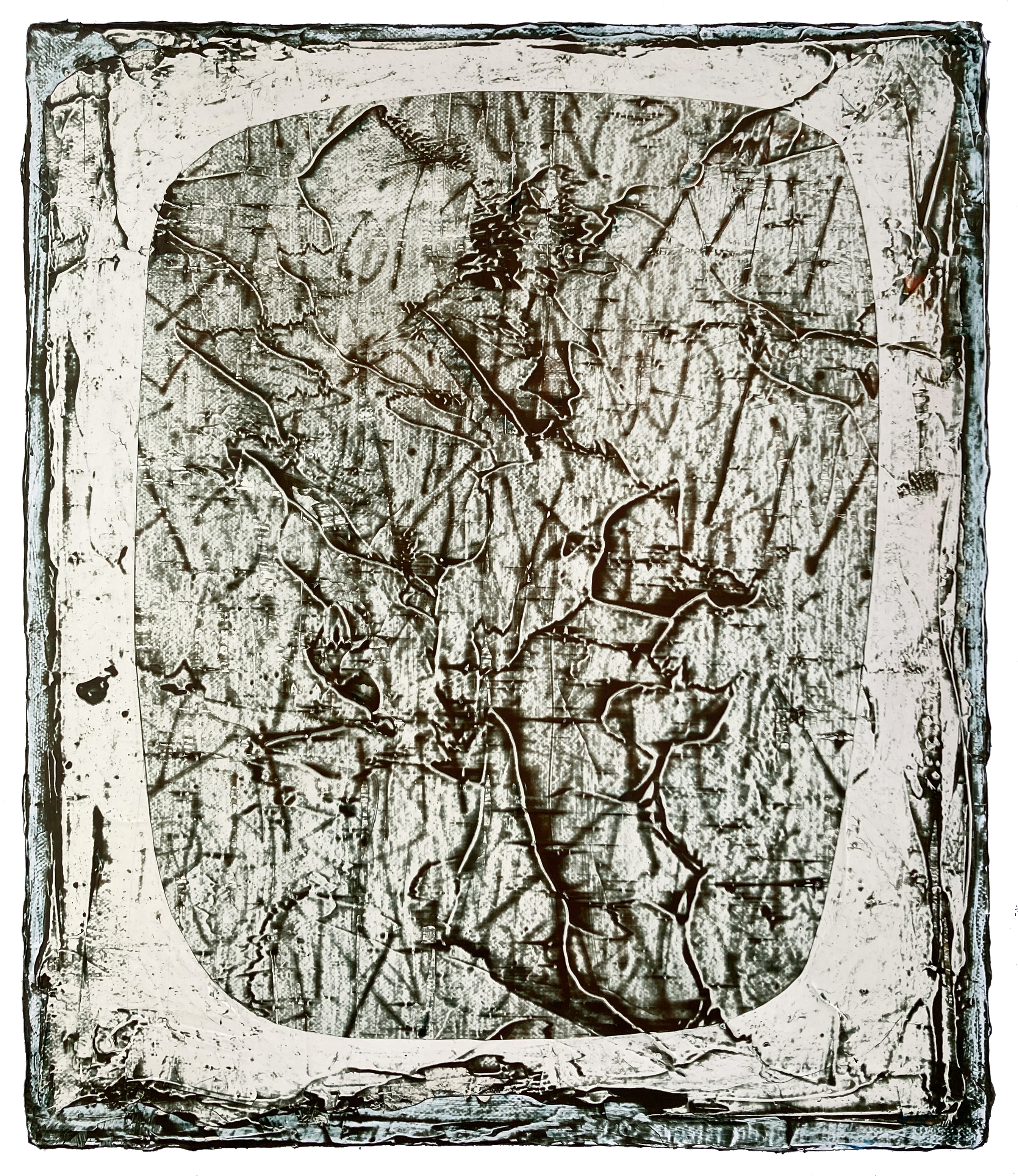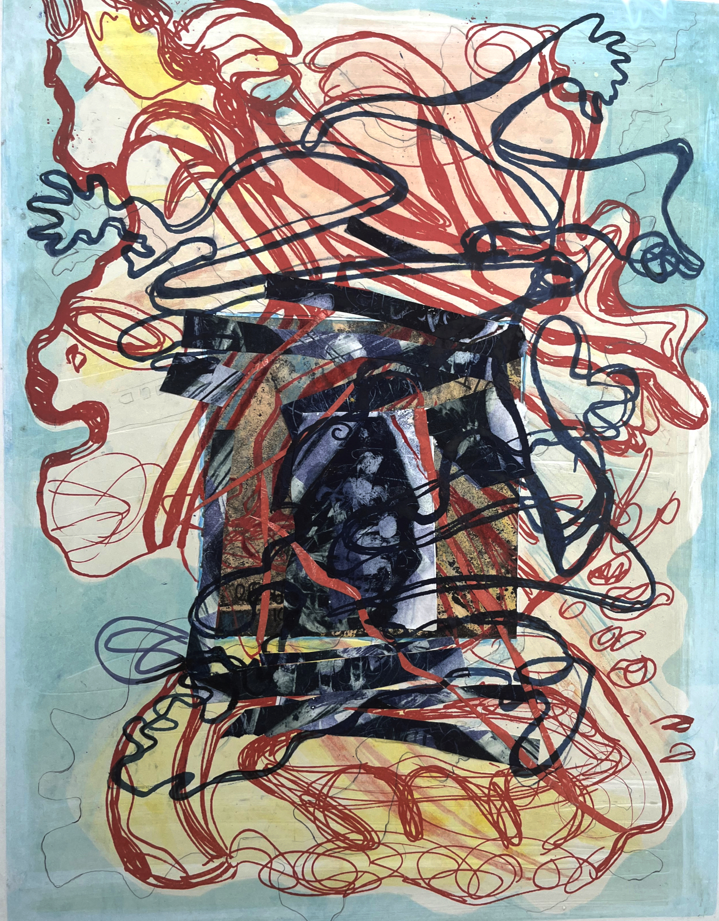 Ann Guiliani is a painter and printmaker whose work serves as a self-protection mechanism deflecting incoming harmful energy. As a child, mark making for this artist provided a way to create and enter a world entirely of her making where curiosity was pursued through mixing materials. As an adult, this practice of world building has become a mechanism to protect her from the harmful effects of an unstable world. “We are bombarded with false narratives on steroids,” Guiliani has said. “We are on overload. As an artist, what do I do? Increasingly the need to create my own world and my own language has become more urgent and quite possibly a point of departure or a means of survival.” The artist works intuitively and employs chance to create works depicting her internal state. In Icon 1 Litigare, the frenetic energy Guiliani experiences from external stimuli reflects turbulence. “This is a litigious and confrontational society,” she says. “A confrontational stand that I was trying to ignore, surfaced and revealed itself in the final image.” The work is in dialogue with the traditional icon paintings of Christian art but evoke more of a disturbance than a “window to the divine.” “Litigare” in the title is the Italian verb “to argue” and is related to the English word “litigate.” In addition to the intense visual energy of the piece, the artist’s mixing of lithography, monoprint, and cyanotype processes aids in the creation of the feverish composition.