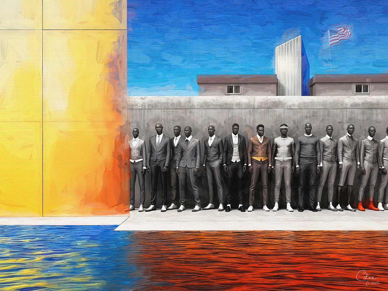 Cecil W Lee refers to his work as “Computer-Evolved Art” where he digitally collates layers sourced from painting, photography, and mixed media to construct an evocative visual narrative. He’s been experimenting with art and technology since he first obtained a computer in the 1980s. The complexity of his work has evolved over time and it has developed incrementally. He often revisits earlier work as both his art’s meaning and his perspective on it change over time. About his exhibited composition They Should Have Known, Lee says, “The men are uniform yet distinct, resisting complete assimilation. Their presence before the stark wall and national flag represents a warning of enforced compliance and retribution.” The men are predominantly depicted in grayscale, yet are surrounded by color. Is their destiny collective or individual? Do their stories take into account their individual complexities or are their characters viewed in terms of black and white? As Lee indicates, the American flag is a symbol of the federal government, an institution of incredible power dictating “enforced compliance” in a system of “justice” benefitting only the most privileged and promising “retribution” if there’s any dissent. Institutions of discipline from the American criminal justice system to higher education ensure predictability by neutralizing the spontaneous organization of bodies: those labeled loiterers or trespassers, unionists striking for better pay and/or working conditions, those protesting and demanding divestment from genocidal governments, and the list goes on. “I have always looked for new ways of seeing and speaking through images, including the resistance of institutionalized distortions,” says Lee. “If language can imprison thought, art can unfasten it. I like to think of my work not as answers to questions but shifts in paradigms.”