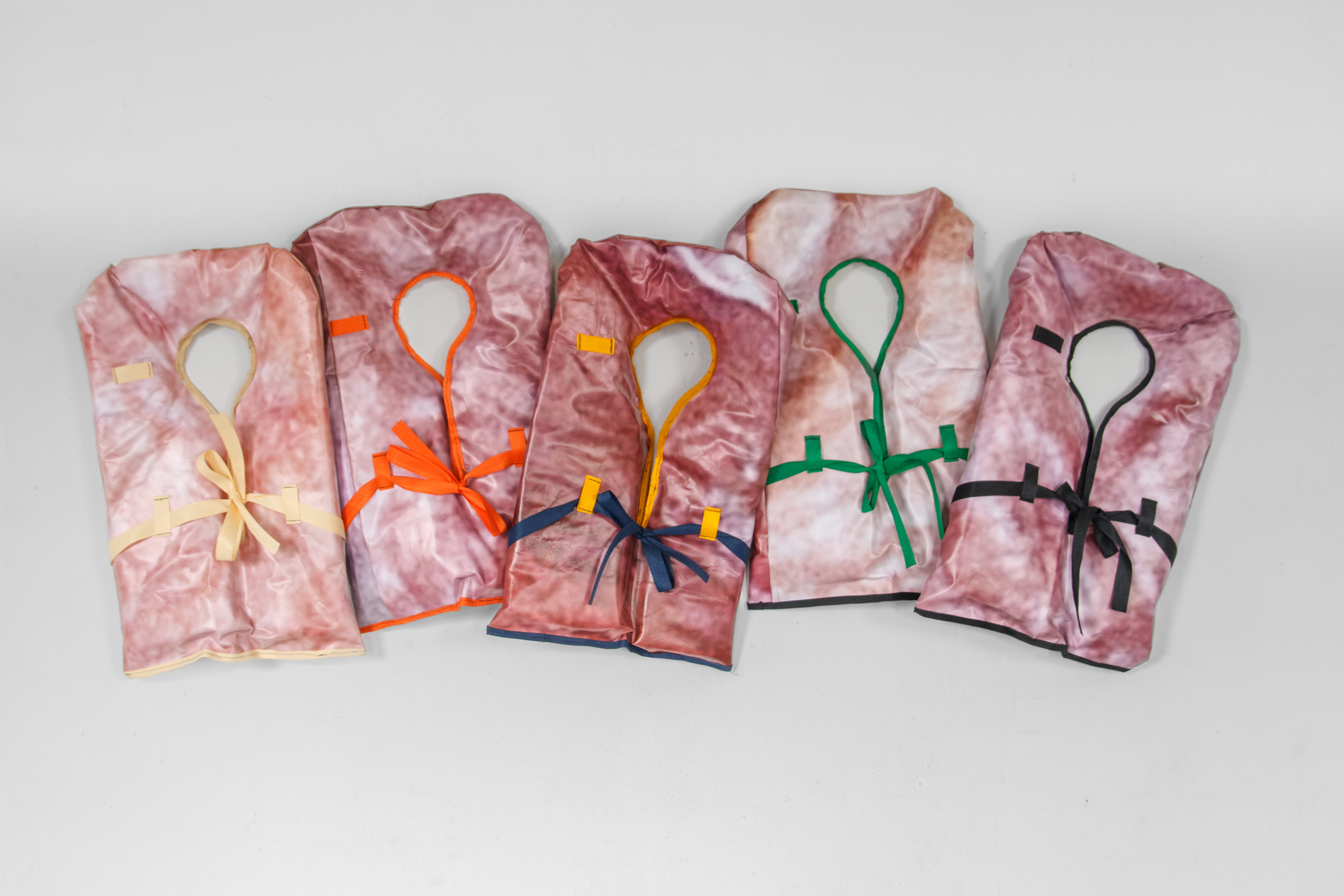 Kasia Ozga, Life Jackets, 2020, Soft Sculpture, Photographs of Human Skin Printed on Vinyl, Recycled Ribbon, Foam Stuffing, Courtesy of the Artist