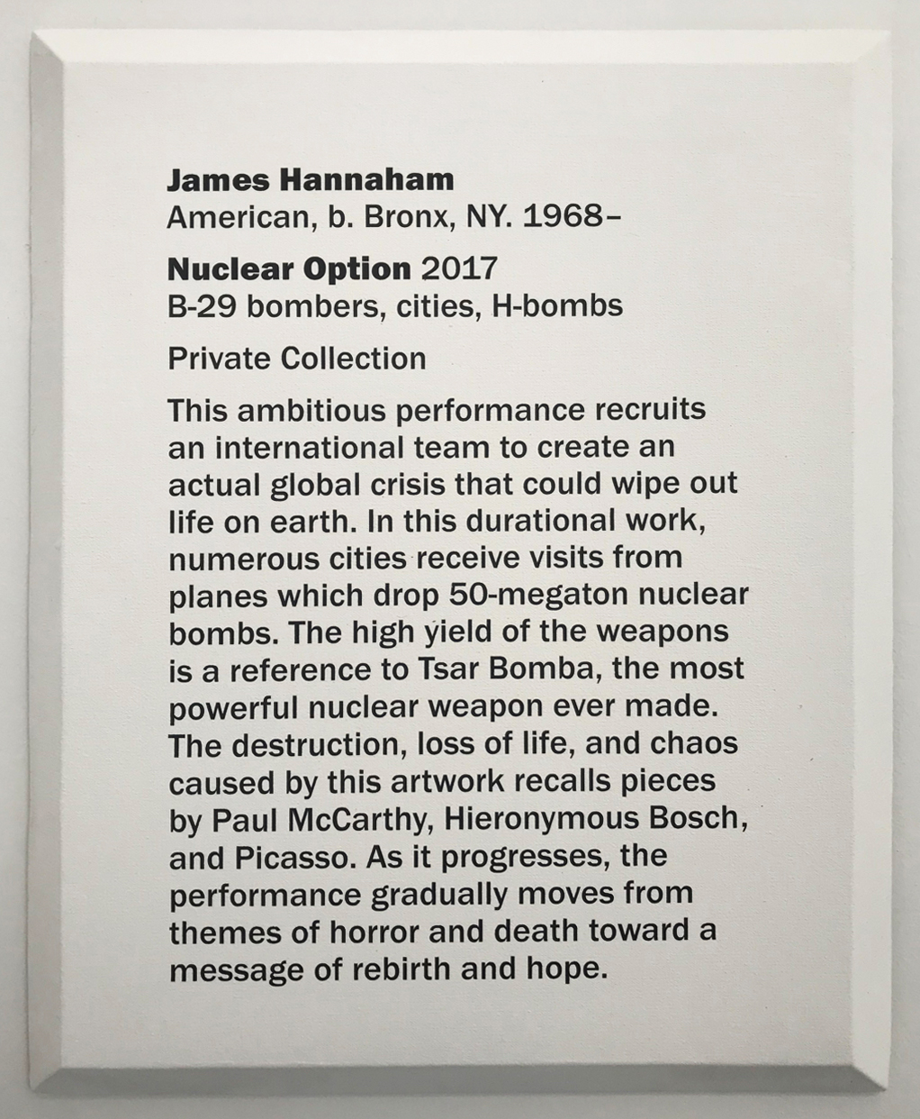 James Hannaham is an artist of words and uses satire to expose structures of power and their effects. In this artist’s exhibited work, Nuclear Option, positions of authority in both the art world and the war room are investigated. Hannaham’s painting is a canvas with beveled edges to mimic the form of exhibition panels and object labels, collectively referred to as “didactics,” in art museums. The curators who are often the ones to author these didactics hold positions of authority and how they position their words can reinforce hierarchies. Curators are often self-styled “experts” about what’s on view and their skewed interpretation of art can be seen as explaining what an artwork depicts and how the public can interpret it. In this work, Hannaham has made the didactics the art object. “The intention of this work,” he says, “has always been to subvert the authority of the institutions through satirizing the words they use to try to explain art, culture, and politics to us and thereby exposing the mechanics of that authority.” In Nuclear Option, Hannaham also critiques the way in which war is discussed in the media. In the painting the artist characterizes the bombing of cities as a durational performance moving from destruction to “a message of rebirth and hope.” Media commentators, like curators, often explain something to others, as if their perspective is all that is relevant. The presentation of news also prioritizes the perspective and interpretation of the correspondent and their “expertise” over the experiences of those directly terrorized by warfare.