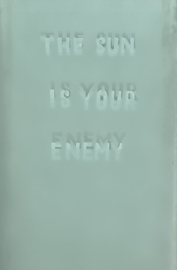 Christopher Squier creates art that challenges the attempts to diminish human thought by playing with the role of light, both literally and conceptually. Monstratsiya Archive (The Sun Is Your Enemy) is a sheet of glass on which a seemingly ominous warning about your relationship with our nearest star is inscribed. “The name ‘monstratsiya,’ a variation on the word for ‘demonstration’ in Russian,” the artist explains, “describes a protest movement that began in Novosibirsk and was known for its use of absurdist protest signs and nonsensical chants. Organized annually throughout the 2010s by performance artist Artyom Loskutov, the May Day parade became a celebration of absurdism, using satire, gibberish, and wordplay to reflect on the protestors’ political reality and the possibility of radical speech-acts in the public realm.” In the solid, yet fragile form of glass, Squier gives permanent physical and archival form to these transitory statements. The phrase “the sun is your enemy” can be interpreted in many ways. As a statement imposed on you, it can be an encouragement to resist change or distrust truth for the ultimate perpetuation of the status quo. The artist has said he has placed the protest signs “within a history of political aesthetic acts” to consider “how illegibility and in/visibility might, in certain cases, be rendered as effective as direct action.”