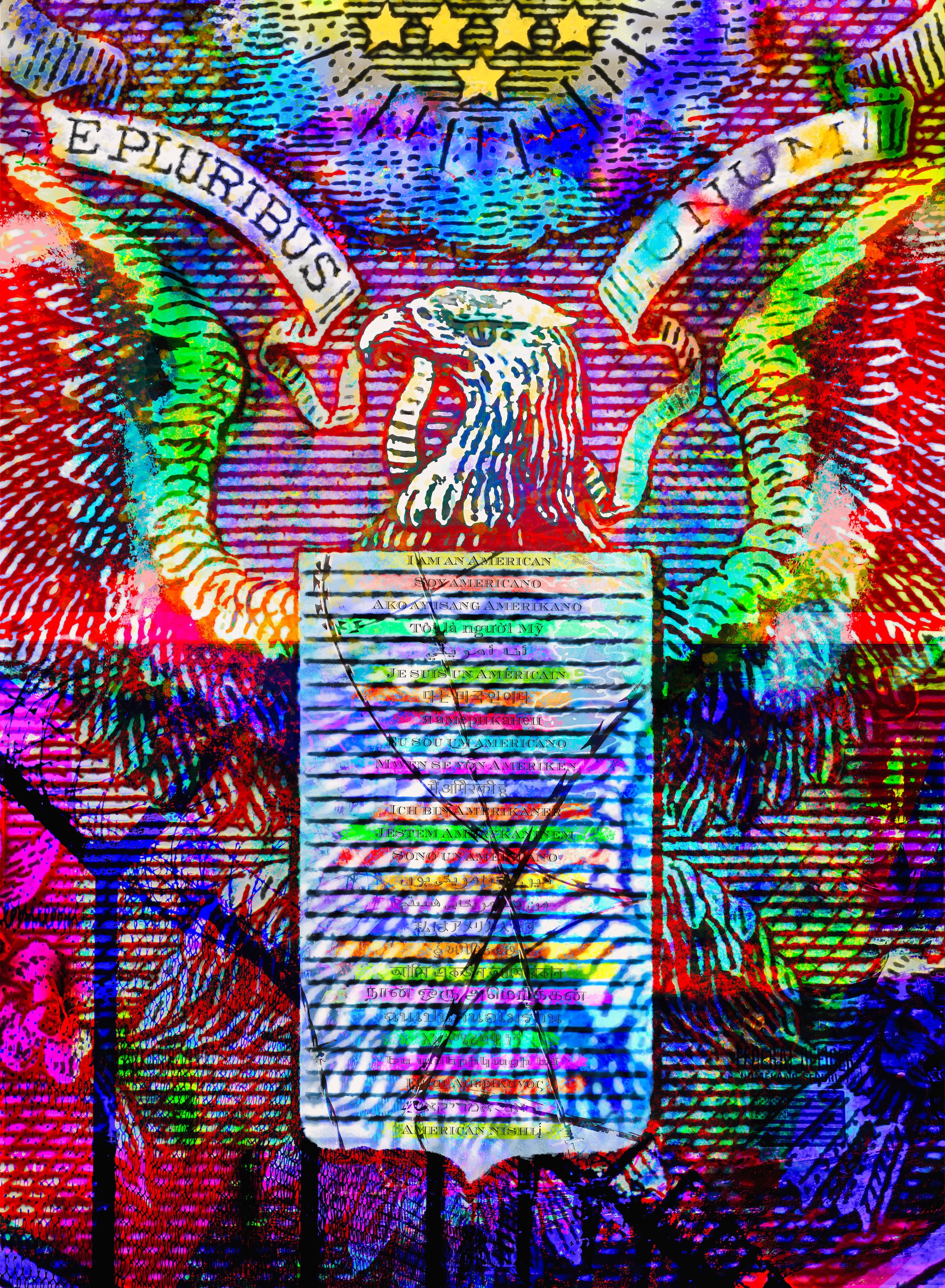 KR Windsor is a designer and digital artist whose primary raw material is the written word. “Words have shadows,” he warns. “They are hidden meanings or ambiguous associations that refract how words are received and understood.” While some of these “shadows” are innocuous and empowering, such as in poetry, they have become increasingly insidious. Many of the impacts of the harmful weight of the written word have been codified as policy via the federal register and Truth Social alike. Racism, misogyny, transphobia and more are not only written into laws; they have become cerebral growths where we have internalized harmful policies, resulting in automated self-oppression. About his exhibited work Identity Crisis, Windsor says “One aspect of the ‘American experiment’ is best expressed in the unofficial motto E pluribus unum—“Out of many, one”… The aspiration of our immigrant nation, and the dream of success and a good life, has been fundamental to our identity, expressed here in 27 of the most spoken languages in the United States. Today, this cohesion is failing as the notion of being an immigrant is demonized, and our… collective identity is challenged and fractured.” Like a virus, our internalized oppression spreads as we’re encouraged to police each other. “At the core of my work,” Windsor says, “is subverting the form–meaning construct of these abstract glyphs we imbue with intention, interrogating how they express the historical record we’re left with, but also mediating the relationships we have with institutions, other cultures and each other.”