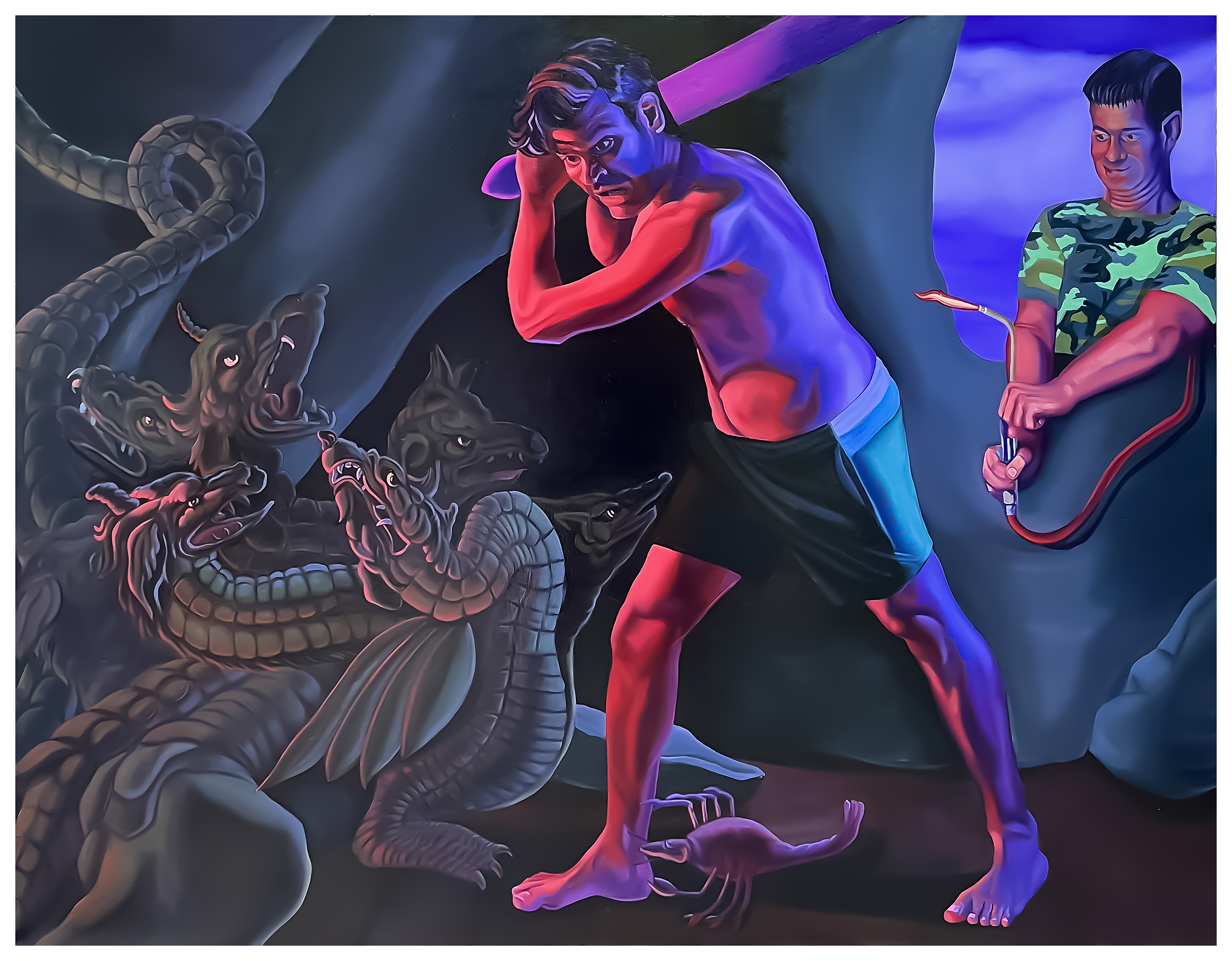 Scott David Isenbarger is a painter whose works question contemporary notions of masculinity while excavating their origins. Isenbarger’s exhibited paintings are inspired by Francisco de Zurbarán’s ten paintings of the labors of Hercules circa 1634. “Zurbarán's paintings offer a somber, primitive vision of masculinity rooted in brute force and political power,” says Isenbarger. “Commissioned to glorify King Philip IV [of Spain], the paintings depict Hercules as an emblem of the monarchy's strength, stripping the myth of its deeper psychological complexity. The hero's journey is not one of self discovery, but a series of raw and brutal conquests, reflecting a narrow and archaic view of male power as something to be wielded for political gains.” Critiquing Zurbarán's painting Hercules and the Hydra, Isenbarger’s painting Don’t Be A Hothead shows a shirtless Hercules in boxer shorts in the moment before slaying the Hydra with a club when he’s assaulted from behind with a blowtorch by a man in camouflage. “Drawing from the flamboyant theatrics of professional wrestling and action movies… with the over-the-top aesthetic of the 90s,” Isenbarger says, “my paintings satirize the shift from a propaganda driven portrayal of masculinity to one driven by entertainment and commercialism, which parallels our contemporary culture and current political climate. The critique lies in the absurdity of the performance. The now pudgy Hercules, posed in overly dramatic lighting and donning MAD magazine-like facial expressions, pokes fun at the idea that true strength is simply a matter of external appearance, revealing how something once solemn and sacred can be reduced to a hollow spectacle.” In doing so, the artist calls our attention to the sense of masculinity that’s marketed to us as something we should emulate and can acquire. As with all advertising, we must remain aware of the positionality of who is glorifying this sense of masculinity and what incentive there is for them to try to get us to glorify it too.